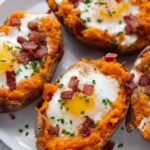 A hearty and delicious Breakfast Sweet Potato recipe featuring baked sweet potatoes filled with a savory mixture of cooked bacon, butter, cheddar cheese, and eggs, then baked until the eggs are perfectly set. Topped with fresh scallions for a flavorful morning meal.