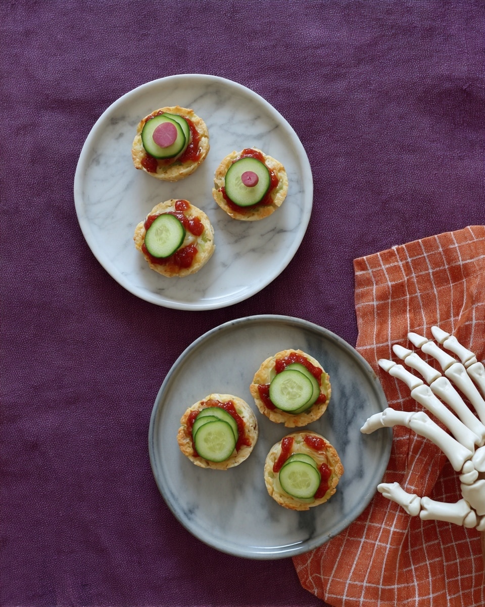 - Decorate to Create Eyeballs: Use cream cheese as an adhesive to place slices of Persian cucumber and pimiento-stuffed olives on top of each puff to mimic the iris and pupil. Finally, squeeze sriracha or ketchup into thin lines around the sides of the puffs to create the look of blood vessels.