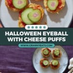These Bite-Size Eyeballs are a spooky and fun Halloween treat made from cheesy choux pastry puffs, decorated with cream cheese, Persian cucumbers, pimiento-stuffed olives, and drizzled with sriracha or ketchup to resemble creepy eyeballs. Perfect for parties or festive snacks!