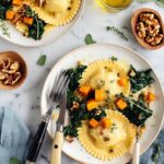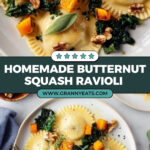 - Serve. Spoon the sauce over the cooked ravioli. Top with chopped walnuts and freshly ground black pepper. Optionally, add roasted butternut squash cubes, sautéed kale, and grated pecorino cheese to enhance the dish.