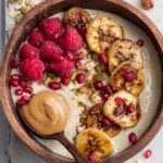 - Assemble the bowl: Spoon the prepared oatmeal into serving bowls. Top each bowl with the caramelised bananas, fresh raspberries, pomegranate seeds, a dollop of smooth nut butter, and a sprinkle of homemade granola for texture and extra flavor.