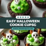 - Decorate: Garnish each filled cookie cup with round green sprinkles, candy eyeballs, and festive Halloween sprinkles. Break pretzel sticks in half and insert one into each cookie cup to serve as a stir stick.