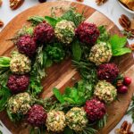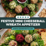 These Mini Cheeseballs Wreaths are a festive and flavorful appetizer perfect for holiday gatherings. Featuring two distinct cheese ball fillings—a zesty ranch blend and a vibrant herb blend—each bite is rolled in a variety of toppings like dried cranberries, pecans, and fresh herbs. The cheeseballs are arranged charmingly in a wreath shape and garnished with fresh rosemary, thyme, mint, and parsley to create an inviting centerpiece that combines taste and presentation effortlessly.