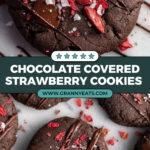 Delight in the rich and fruity combination of Chocolate Covered Strawberry Cookies, featuring cocoa-infused dough studded with freeze-dried strawberries and chocolate chips, finished with a smooth semisweet chocolate coating for an irresistible treat.