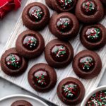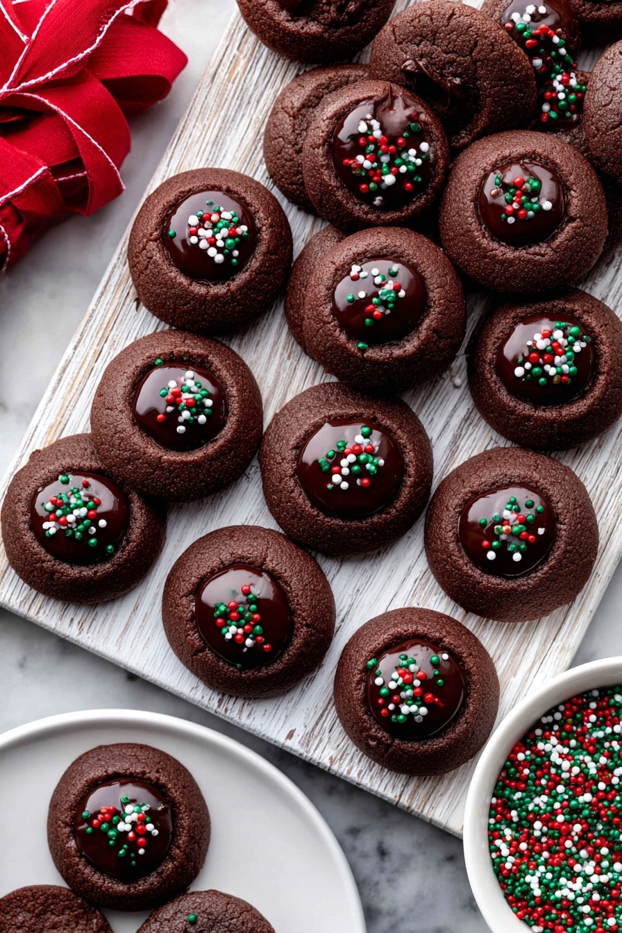 These Chocolate Thumbprint Cookies combine a rich, cocoa-flavored buttery cookie with a luscious chocolate ganache center. Perfectly soft with a slight crisp edge, these cookies are pressed and chilled before baking to maintain their shape, then filled with a silky ganache and optionally topped with festive nonpareils for a delightful treat ideal for chocolate lovers.