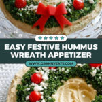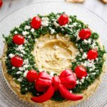 Celebrate the holidays with this Easy Christmas Appetizer Hummus Wreath, a festive and colorful dish featuring creamy hummus layered with crumbled feta, fresh green onions, and Italian parsley, decorated with cherry tomatoes and optional red pepper bow for a vibrant, healthy party centerpiece.