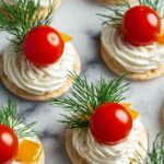These Simple Christmas Ornament Appetizers are festive, bite-sized treats perfect for holiday parties. Made with crisp rice crackers topped with creamy whipped cream cheese, fresh dill sprigs, cherry tomatoes, and a touch of yellow bell pepper, these colorful appetizers resemble Christmas ornaments that are both visually appealing and deliciously light.