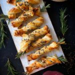 Place your rolled crackers on the parchment-lined trays. Brush each one generously with the remaining melted butter — don’t skimp here, it’s what gets you that irresistible golden crunch. Sprinkle black sesame seeds over the top for that striking visual and subtle nutty flavor. Pop the trays into your preheated oven and bake for 15-20 minutes or until the filo turns a beautiful golden brown.
