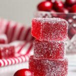 These Festive Cranberry Jelly Candies are a delightful homemade treat featuring the tartness of cranberry juice set into a firm, gelatin-based jelly. Coated generously in granulated sugar to create a crunchy exterior, these candies are perfect for holiday gifting or enjoying as a special sweet snack. The process involves simmering cranberry juice with gelatin and sugar, then cooling and cutting into sugar-coated squares that develop a lovely crystalline finish after drying.