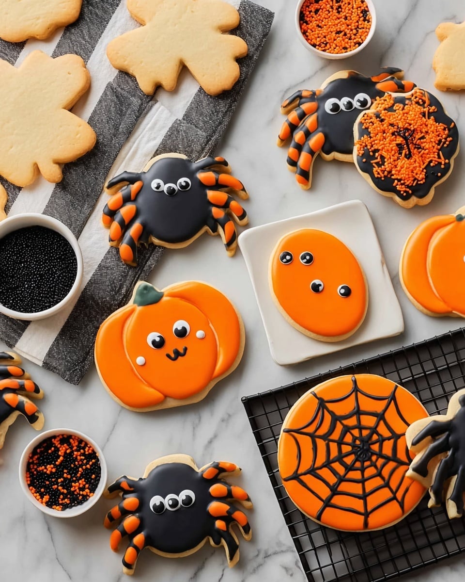- Decorate Orange Spider Cookies: Pipe the spider body with warm orange icing, immediately add candy eyes and nonpareils, then pipe black icing legs.