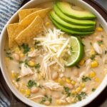 This creamy and flavorful White Chicken Chili combines tender shredded chicken, cannellini beans, mild green chilies, and a blend of spices simmered in a comforting broth enriched with Neufchatel cheese. Perfect for a cozy meal, it’s garnished with fresh cilantro, lime juice, and optional toppings like avocado, Monterrey Jack cheese, and tortilla chips for added texture and flavor.