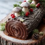 - Assemble the Yule Log: Remove the cake from plastic wrap and place it on a serving platter or rustic wooden board. Frost the entire cake with the chocolate buttercream, creating bark-like lines for authenticity. Decorate with fresh cranberries, edible mushrooms or meringue mushrooms, sprigs of rosemary, and edible glitter or snow to evoke a festive winter woodland scene.