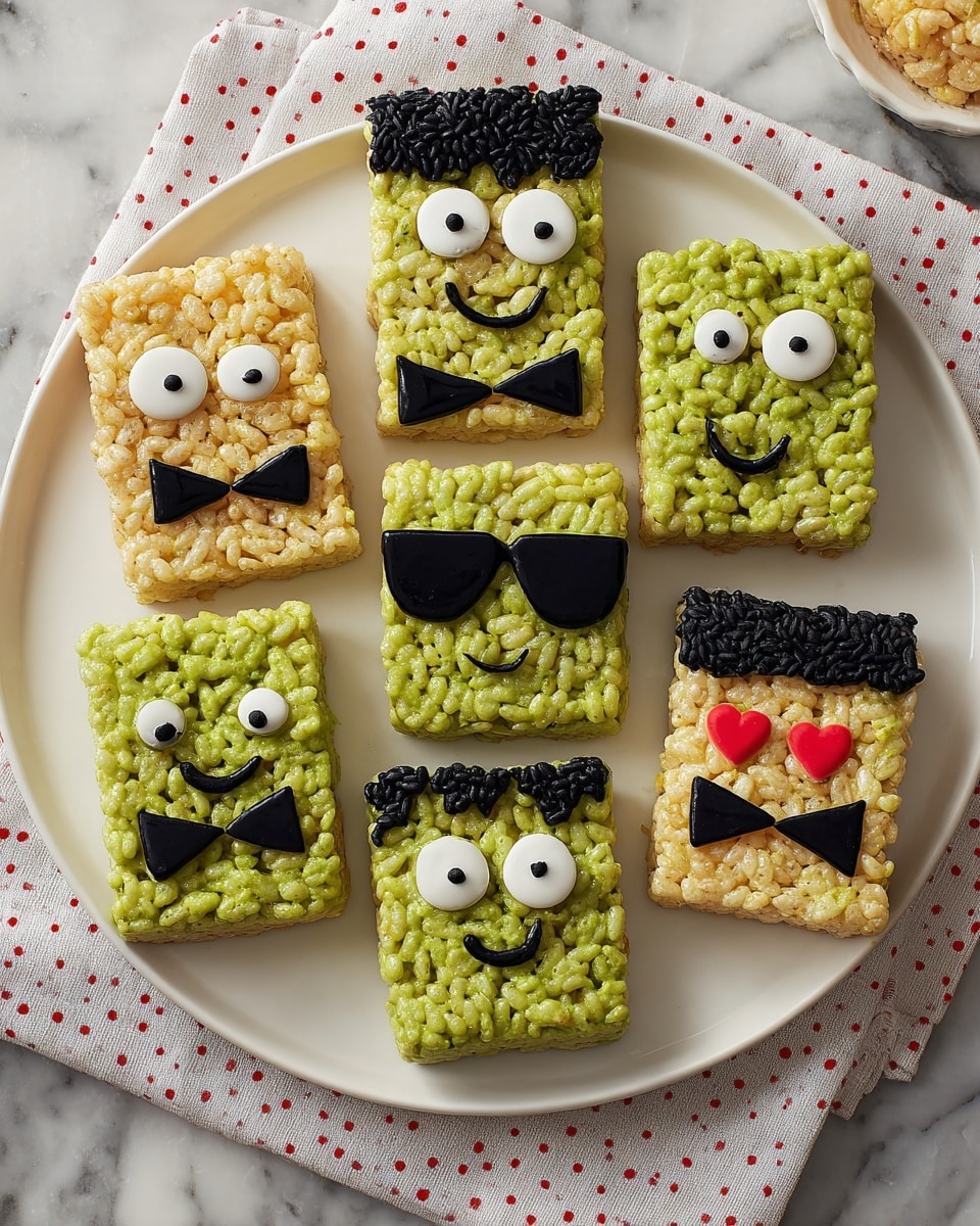For Halloween parties, I arranged my Frankenstein Cereal Treats vertically on a dark serving tray with some cobweb decorations and LED candles around—total crowd-pleaser! You can also stack them with toothpicks like little towers or package them individually in clear bags tied with green ribbon for gifting.