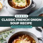 This classic French Onion Soup recipe features caramelized yellow onions simmered with thyme, garlic, and a splash of white wine, finished with a savory blend of vegetable broth and topped with toasted baguette slices smothered in melted Gruyère and Parmesan cheese. Perfectly balanced with a hint of balsamic vinegar and tamari for depth, this hearty and comforting soup is ideal for cozy meals.