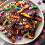 This Fun Halloween Candy Bark is a festive and colorful treat perfect for spooky celebrations. Featuring layers of melted orange and dark cocoa candy melts combined with crunchy pretzels, candy eyeballs, and festive sprinkles, this bark is easy to make and great for sharing at Halloween parties or as a fun seasonal dessert.