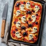 This Ghostly Pizza recipe is a fun and festive twist on classic pizza, perfect for Halloween gatherings. Featuring a golden, crispy crust topped with marinara sauce, mozzarella or provolone cheese cut into ghost shapes, and decorated with sliced olives to create spooky spider legs and eyes, it’s both delightful and easy to prepare within 30 minutes.