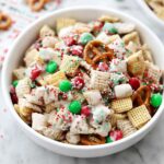 This Gluten-Free Christmas Chex Mix is a festive, crunchy snack blend perfect for holiday gatherings. Featuring a mix of Rice Chex, Corn Chex, Cheerios, gluten-free pretzels, salted peanuts, and colorful red and green M&Ms, all coated in a smooth, vanilla white chocolate almond bark coating. Garnished with additional M&Ms and optional festive sprinkles, it offers a delightful balance of sweet and salty flavors in easy-to-make clusters.