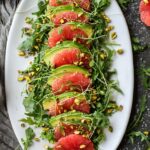 A refreshing and vibrant Grapefruit and Avocado Salad featuring peppery arugula, juicy ruby red grapefruit segments, creamy avocados, crunchy pistachios, and delicate microgreens, all brought together with a simple drizzle of olive oil and a sprinkle of coarse sea salt. Perfect for a light lunch or a colorful side dish.