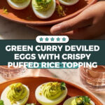 These Green Curry Deviled Eggs are a vibrant twist on the classic appetizer, combining the rich flavors of green curry, fresh herbs, and a crispy puffed rice topping. The filling is blended smooth with coconut oil and fragrant aromatics, then piped into tender egg whites and garnished with a spicy, turmeric-infused puffed rice mix for a delightful texture and flavor contrast. Perfect as an elegant appetizer or party snack with a Southeast Asian flair.