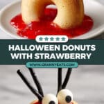 Create spooky and fun Gross Guy Halloween Donuts perfect for a festive treat. These baked cake donuts are decorated with candy eyes, licorice eyebrows and hair, and filled with a gooey mixture of strawberries and strawberry filling for a creepy yet delicious Halloween dessert.