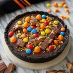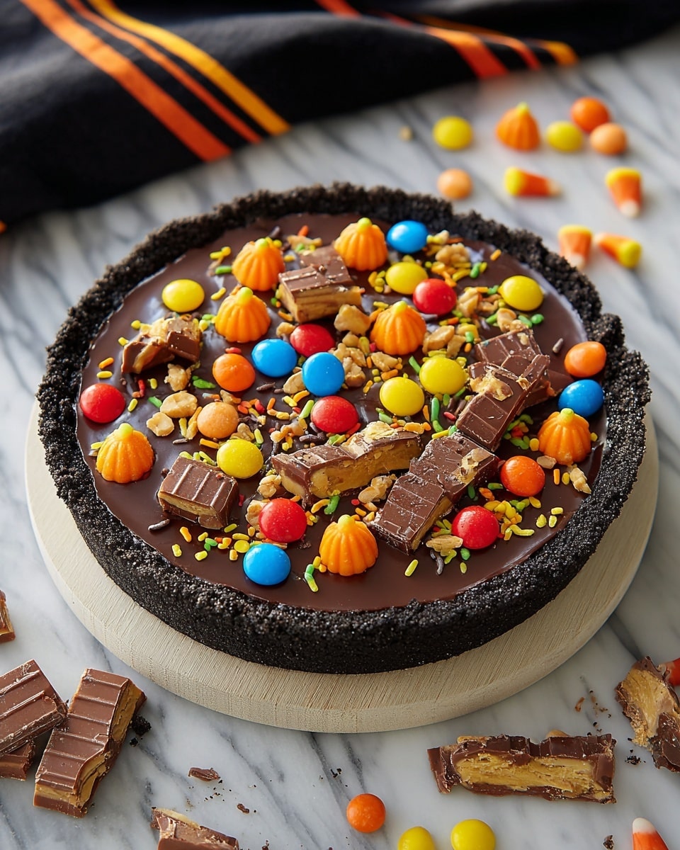 This Halloween Candy Ganache Tart combines a rich chocolate cookie crust with a smooth dark cocoa ganache filling, topped with festive Halloween sprinkles and candies. Perfect for spooky celebrations, it offers a delightful blend of creamy, crunchy, and chocolaty textures that are sure to impress your guests.