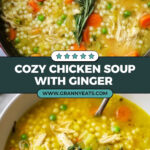 A hearty and flavorful chicken soup made with fresh garlic, ginger, turmeric, and tender chicken simmered in a savory chicken broth, finished with pearl couscous and peas. This comforting soup is easy to make and perfect for any season.