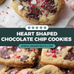 It’s best to cut them while the cookies are still warm and soft for clean heart shapes. Once fully cooled, the cookies harden and may crack if you try to cut them. If you need to prepare in advance, freeze the dough as heart-shaped balls if your cutter is large enough, or simply bake regular chocolate chip cookies without cutting.