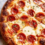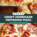 This homemade pepperoni pizza recipe features a perfectly crispy crust topped with a flavorful homemade pizza sauce, plenty of mozzarella cheese, and generous slices of pepperoni. It’s baked at a high temperature to achieve a golden-brown crust with delicious charred spots. Optional honey butter is served alongside to add a sweet dipping treat for the crust. Ideal for a family dinner or casual gathering, this easy recipe ensures a satisfying and classic pizzeria-style experience at home.