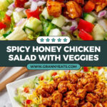 While the chicken mixture freezes well, I don’t recommend freezing the salad once assembled because the veggies don’t thaw nicely. Freeze only the honey hot chicken portion if you want to save some for later.
