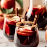 I always garnish my sangria glasses with a cinnamon stick and a few fresh apple slices—looks stunning and amps up the flavor and aroma. Thin orange wheels also add a pop of color and citrusy brightness. If it’s a party, don’t be shy with the cinnamon-sugar rims; they add that fun festive touch that guests comment on every time.