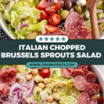 A vibrant and flavorful Italian Chopped Brussels Sprouts Salad featuring a zesty homemade Italian dressing, tender shredded Brussels sprouts, savory salami, chickpeas, fresh tomatoes, olives, pepperoncinis, red onion, provolone, and parmesan cheese. This hearty salad is perfect for a refreshing lunch or a light dinner and can be easily customized to suit vegetarian preferences.