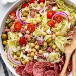 A vibrant and flavorful Italian Chopped Brussels Sprouts Salad featuring a zesty homemade Italian dressing, tender shredded Brussels sprouts, savory salami, chickpeas, fresh tomatoes, olives, pepperoncinis, red onion, provolone, and parmesan cheese. This hearty salad is perfect for a refreshing lunch or a light dinner and can be easily customized to suit vegetarian preferences.