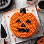 4. Decorate cake: Decorate the top of the stem with black candy-coated candies to mimic pumpkin seeds or texture. Then, fill the cavities for the eyes, nose, and mouth with remaining black candies to complete the Jack-O’-Lantern face. Finally, arrange orange candies on the cake’s top surface to add extra color and festive décor.