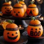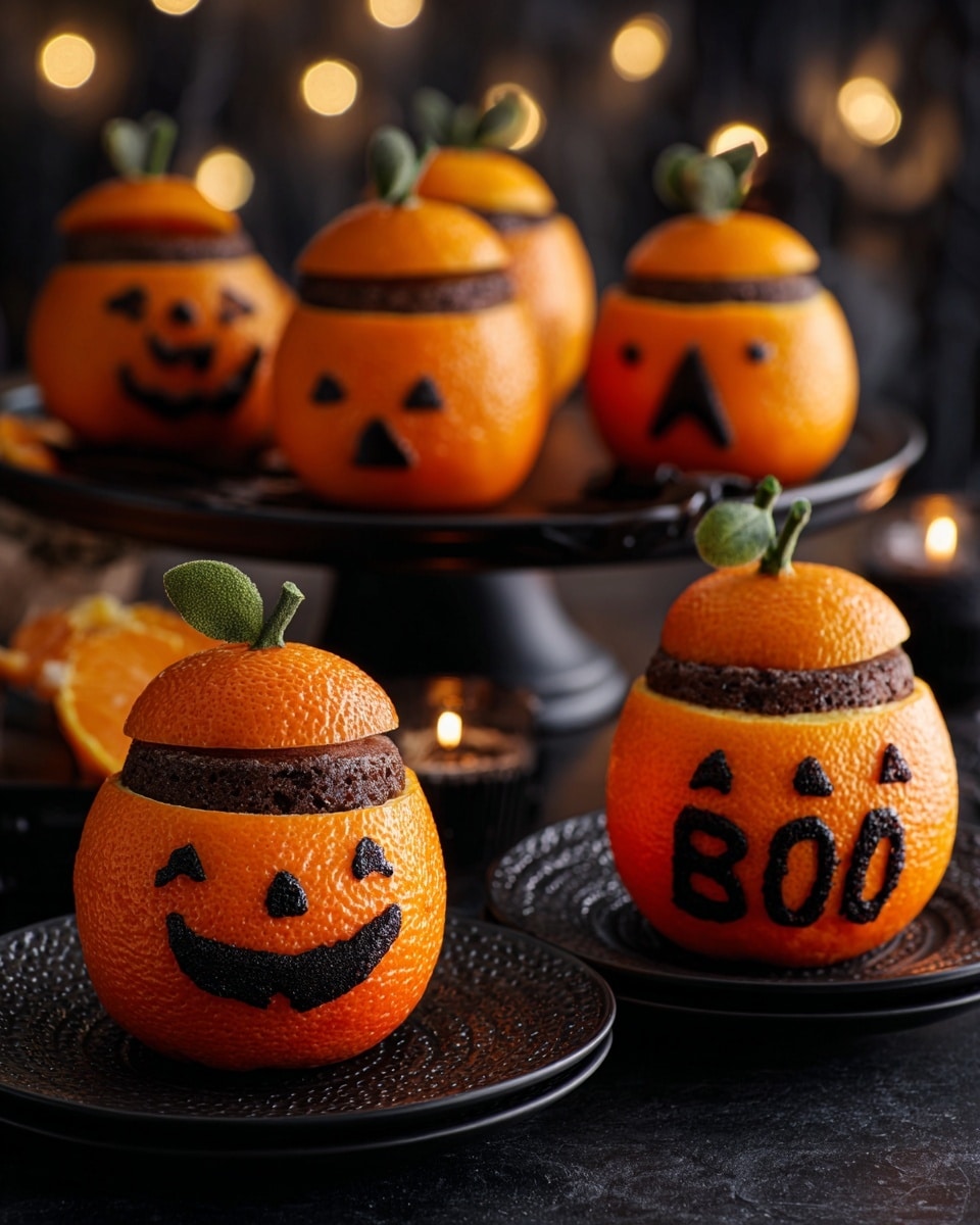 For Halloween parties, I’ve arranged these orange Jack-o’-lanterns on a bed of autumn leaves or moss on a rustic wooden tray — it’s a showstopper. Another fun idea is to place mini LED tealights inside peeled but uncooked oranges for decoration, then replace your baked ones on top right before serving for a glowing, spooky effect.