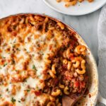 Johnny Marzetti is a comforting and hearty casserole dish featuring tender elbow macaroni mixed with a savory blend of Italian sausage, ground beef, mushrooms, and vegetables, all baked in a rich tomato sauce layered with melted mozzarella and cheddar cheeses for a perfect cheesy finish.