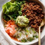 Korean Beef Bulgogi Rice Bowls feature flavorful ground beef cooked in a sweet and savory bulgogi sauce, served over rice with fresh vegetables, spinach, and pickled ginger for a quick and satisfying meal. This easy recipe brings authentic Korean flavors to your kitchen without the need for marinating or special cuts of meat.