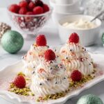 These Mini Pavlova Christmas Trees are a festive and elegant dessert perfect for holiday celebrations. Crispy on the outside and soft inside, the delicate meringue trees are piped to resemble Christmas trees, topped with whipped cream, silver cachous, fresh raspberries, and pistachio crumbs for a delightful combination of texture and flavor.