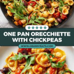 A vibrant and easy one-pan orecchiette pasta dish featuring hearty chickpeas, tangy Kalamata olives, sweet cherry tomatoes, and fresh herbs, all cooked together to create a flavorful, saucy meal perfect for a quick weeknight dinner.