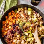 This One-Pot Easy Harvest Chicken Skillet is a hearty and flavorful fall-inspired dish combining tender chicken, crispy bacon, sweet potatoes, Brussels sprouts, apples, walnuts, and dried cranberries. Cooked in a single skillet with warming spices like cinnamon and nutmeg, this meal is perfect for an easy weeknight dinner that brings comforting seasonal flavors together in one pan.