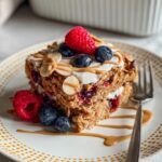 This Peanut Butter and Jelly Baked Oatmeal is a comforting and nutritious breakfast option that combines the classic flavors of peanut butter and jelly with wholesome rolled oats. Baked to perfection, it offers a warm, hearty start to your day with a deliciously gooey texture and a sweet swirl of jelly.