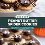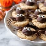 These Peanut Butter Spider Cookies are a quick and fun Halloween treat featuring peanut butter cookies topped with Reese’s peanut butter cups and decorated with melted chocolate spider legs and candy eyeballs. Perfect for festive celebrations and easy to assemble, they bring a playful creepy-crawly vibe to your dessert table.