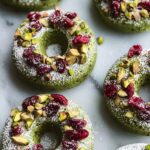 These Pistachio Cranberry Wreath Cookies are a festive and tender treat perfect for holiday celebrations or any special occasion. The buttery cookies are studded with crunchy pistachios and tart dried cranberries, shaped into charming wreaths, and finished with a delicate dusting of powdered sugar and extra nuts and berries for decoration.