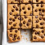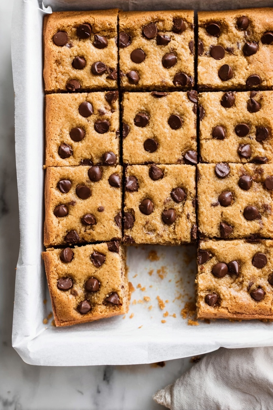 Press the dough evenly into your prepared pan with an offset spatula, sprinkle the last 1/4 cup of chocolate chips on top, and pop it into the oven. Bake for 25 to 30 minutes until the edges are set, the top is golden, and a toothpick comes out mostly clean (a few moist crumbs are perfect). Let the bars cool completely on a wire rack before slicing—this step is key for neat squares and the perfect bar texture.