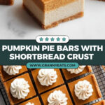 Delicious and creamy Pumpkin Pie Bars featuring a buttery shortbread crust topped with a spiced pumpkin filling and finished with a light whipped cream topping. Perfect for fall gatherings and holiday celebrations, these bars combine classic pumpkin pie flavors in an easy-to-serve bar format.