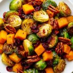 A festive and flavorful side dish perfect for Thanksgiving, featuring roasted Brussels sprouts and cinnamon-spiced butternut squash tossed with toasted pecans and dried cranberries, finished with a touch of maple syrup for sweetness.