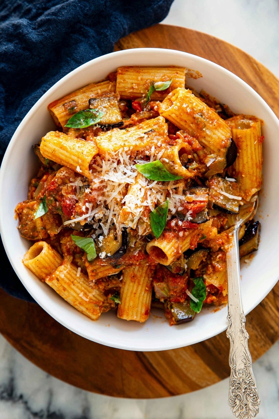 Add your pasta back to the pot (off the heat) with a couple tablespoons of the reserved pasta water, then pour in the sauce with eggplant. Stir gently to coat every strand or tube with that luscious sauce. Sprinkle in about two-thirds of your cheese, saving the rest for garnish. This is when you want to taste and adjust seasoning—if you feel it needs a pinch more salt or pepper, go for it! If the sauce seems too thick, don’t hesitate to add a splash more pasta water to reach your preferred consistency.