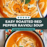 A comforting and flavorful roasted red pepper ravioli soup made by roasting fresh vegetables and blending them into a smooth base, then simmering with savory ravioli. This soup is perfect for a cozy meal, garnished with cream, fresh basil, and a hint of crushed red pepper flakes for a gentle kick.