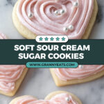 The image shows heart-shaped cookies topped with light pink frosting arranged on a white marbled surface. Each cookie has one thick base layer of golden-baked dough with a smooth texture, and the frosting is piped in tight, even swirls that follow the heart shape, creating a raised, soft layer. Small shiny white and silver pearl sprinkles are scattered on top of and around the frosting, adding a delicate touch of decoration. The cookies have soft edges, and the frosting looks creamy and smooth. Photo taken with an iphone --ar 2:3 --v 7 - Soft Sour Cream Sugar Cookies with Cream Cheese Frosting, sour cream sugar cookies, creamy frosting cookies, soft sugar cookie recipe, best sugar cookies with frosting