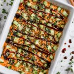 - Add Final Toppings: Remove from oven and drizzle 1/2 cup spicy mayo and 1/4 cup unagi sauce evenly over the top. Sprinkle an additional 1-2 Tbsp furikake. Optionally, garnish with chopped cucumber and green onion for added freshness and crunch.