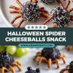 Delight your Halloween party guests with these spooky and savory Spider Cheeseballs. Creamy cream cheese combined with tangy goat cheese, fresh herbs, and a hint of garlic is rolled into spooky balls, coated with black sesame seeds to resemble spider bodies, and finished with pretzel sticks as creepy legs. Perfect for a festive appetizer or party snack.